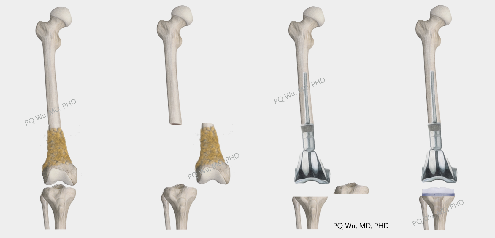 前面文章有提到,當我們將腫瘤切除後,我們可以用生物性重建或是腫瘤型人工關節來做肢體重建。相對於生物性重建使用『骨頭』來重建骨缺損,腫瘤型人工關節則是完全由『金屬之人工關節』所取代。手術步驟較生物性重建簡易且迅速,我們可以見下圖示之說明: