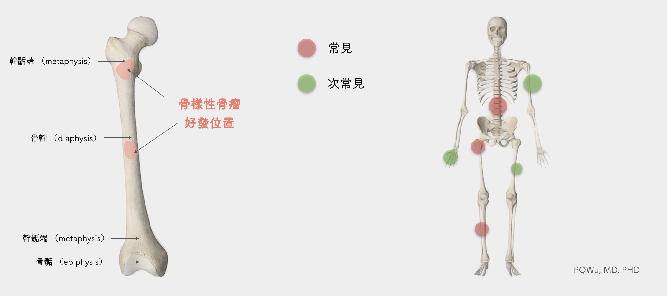醫學上,我們將骨頭分為骨骺(epiphysis)、幹骺端(metaphysis)與骨幹(diaphysis),而骨樣性骨瘤多大多發生在骨幹之兩端,與一般的骨腫瘤不大相同。 (按:『骺』的正確唸法為 『ㄏㄡˊ』,但臨床上我們習慣唸『ㄍㄡˋ』)