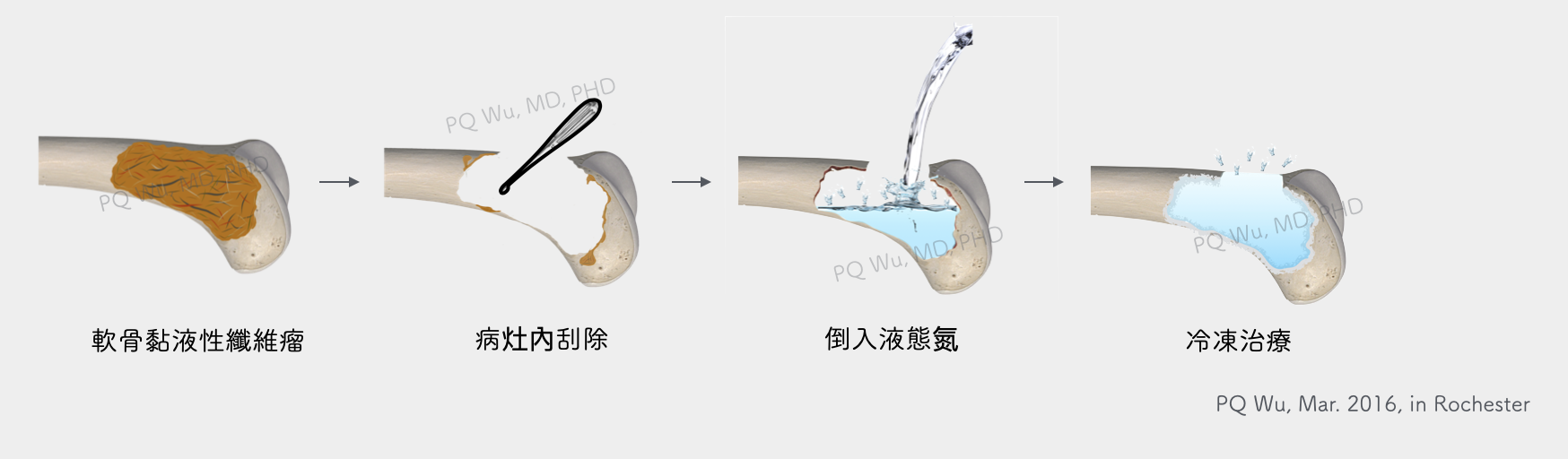 軟骨黏液性纖維瘤的手術,是絕對需要的!且手術後恢復的情況,與手術前軟骨黏液性纖維瘤的型態有相當大的關係。有部分的軟骨黏液性纖維瘤表現會非常的激烈(aggressive),嚴重的破壞骨頭並侵犯周遭的正常組織。像這樣的軟骨黏液性纖維瘤手術後的復發機會便會非常的高。甚至在美國梅約中心的報告中,有三例的病患需要進行截肢手術(一共五十位,所以約佔 6%)。為了減少手術後的併發症,手術的步驟須包括病灶內的腫瘤切除,切除後之輔助治療與骨移植三個步驟。這三個步驟,我分別於三篇文章中詳述,大家可以點下方的連結進入。